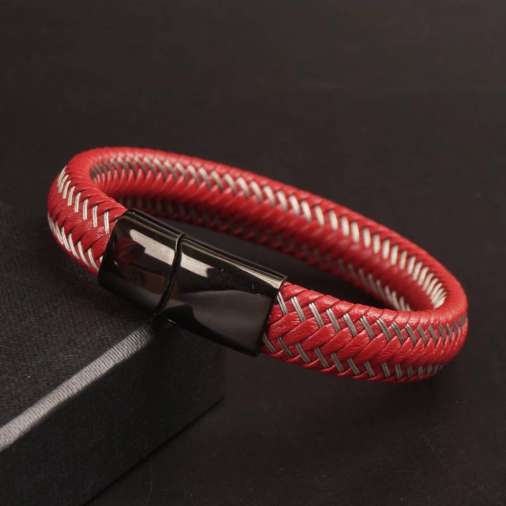 Red Leather silver Wire with Black magnetic lock Leather Bracelet