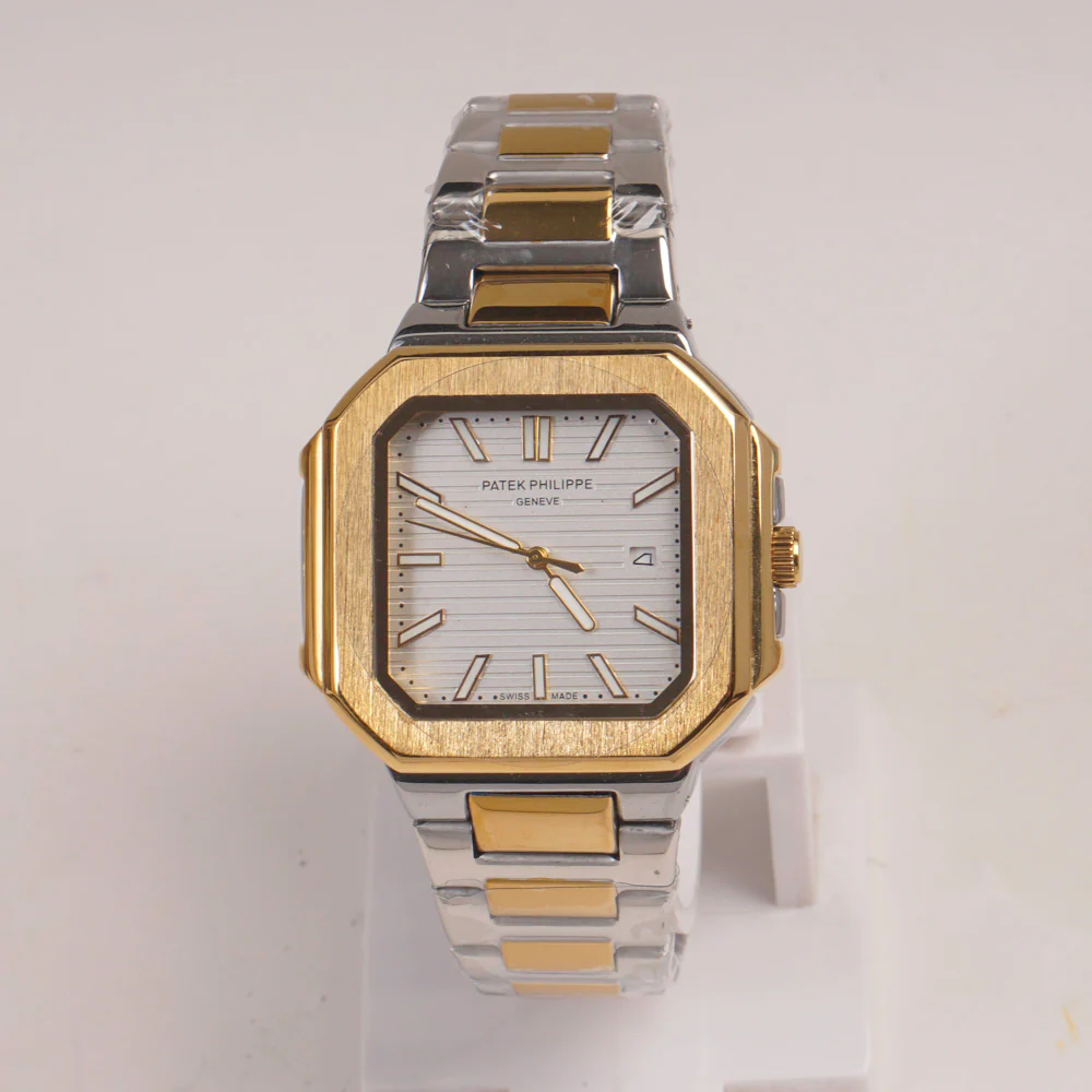 Two Tone Mens Chain Square Wrist Watch White Dial