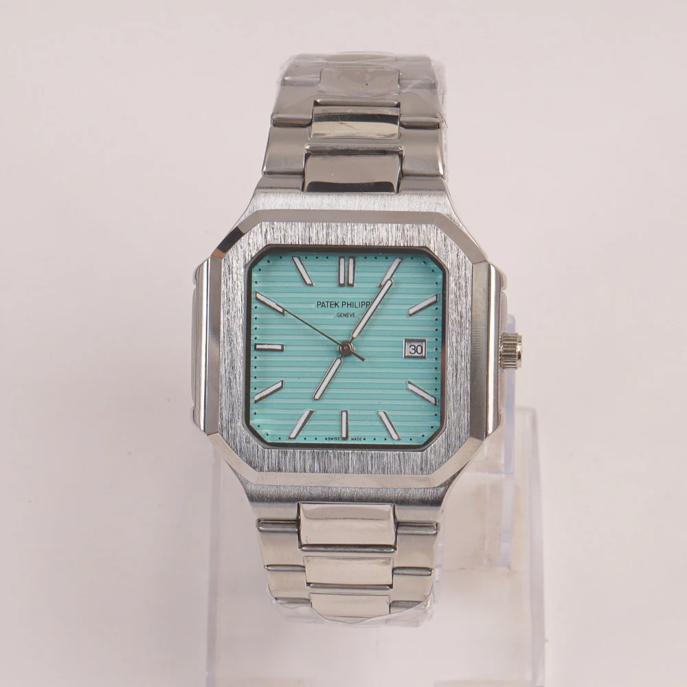 Mans Silver Chain Wrist Watch Cyan Dial