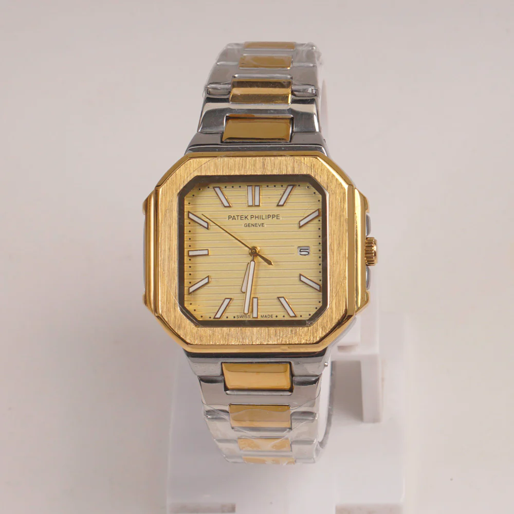 Two Tone Mens Chain Square Wrist Watch Golden Dial